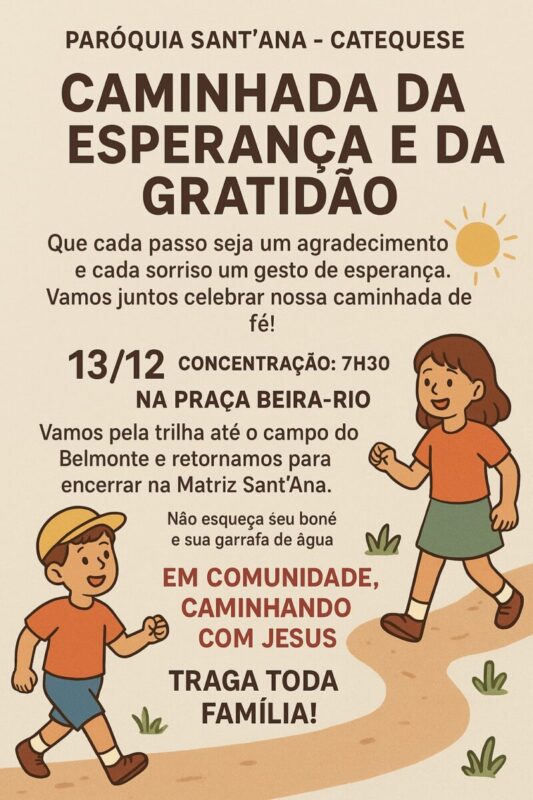 CATEQUESE – CAMINHADA DA ESPERANCA E GRATIDÃO 13/12 – 7h30: Concentração na Praça Beira Rio (Ver detalhes abaixo) CONVIDE AMIGOS, FAMILIARES…